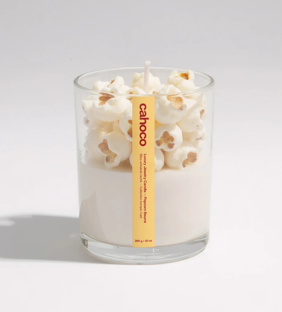 Une bougie parfumée Popcorn caramélisé, coulée en cire 100 % soja pour une combustion plus propre et plus lente. Dans le coffret, à côté de la bougie, un pochon en velours cache une pochette argentée alu à déchirer. Dedans : un bijou Cahoco en acier inoxydable, numéroté, en édition limitée, plus ou moins rare. Tu profites d’un parfum ultra régressif façon cinéma… et d’un bijou que tu peux porter longtemps.