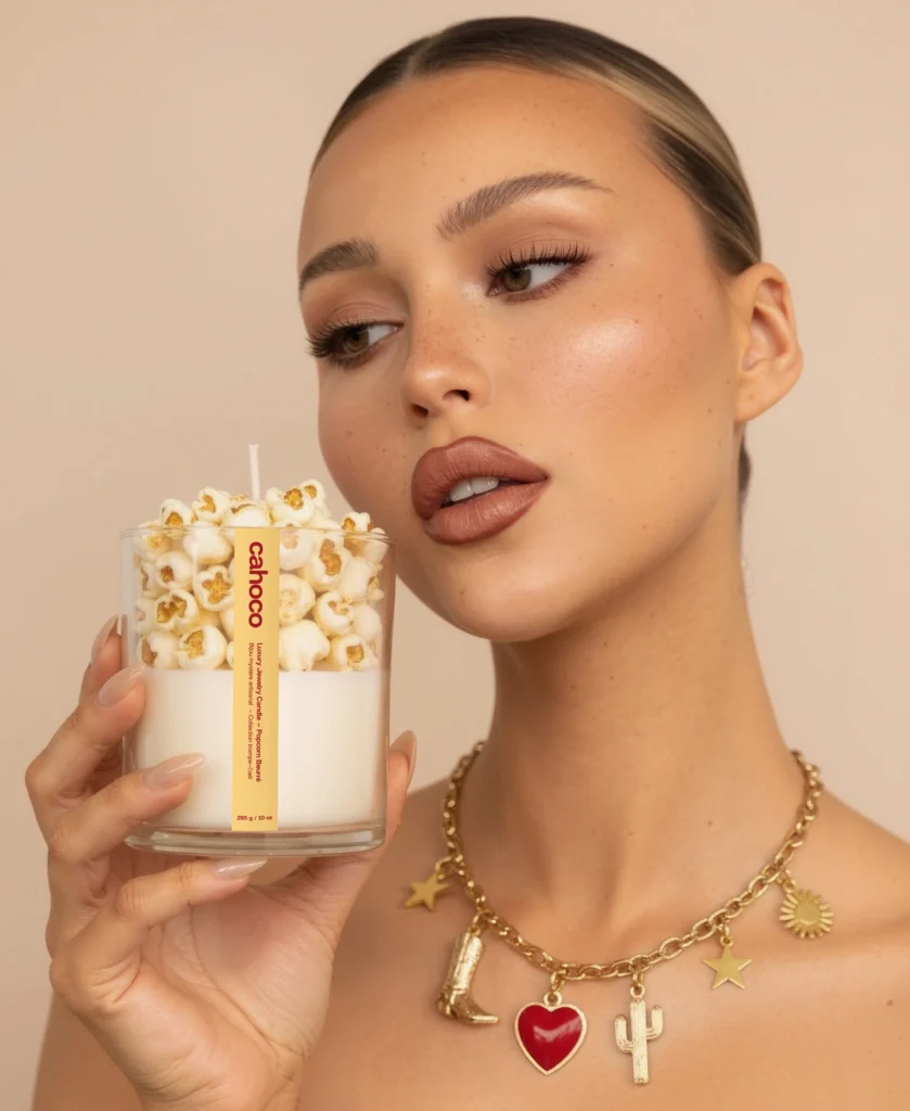 Chez Cahoco, on ne se contente pas de glisser un bijou dans une bougie : on construit un coffret cohérent et qualitatif. La bougie est formulée en cire 100 % soja, avec une mèche en coton et un parfum Popcorn caramélisé travaillé, pour rivaliser avec des marques de bougies spécialisées. Le bijou n’est pas un simple accessoire : c’est un bijou en acier inoxydable, numéroté, en édition limitée, présenté dans un pochon velours et une pochette argentée scellée comme un véritable objet de collection. Le résultat, c’est un cadeau qui fait plaisir pour de bonnes raisons : qualité visible, concept fort et expérience d’ouverture mémorable.